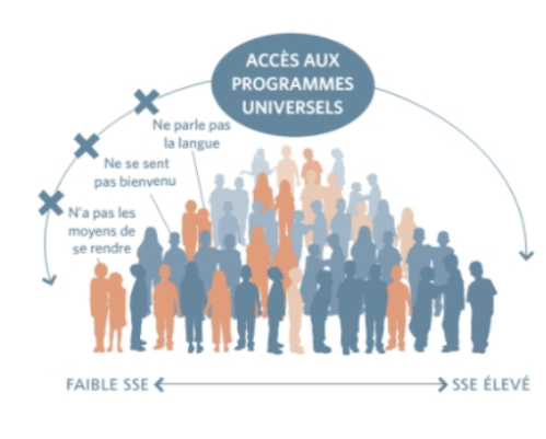 C’est là qu’intervient l’universalisme proportionné, définit par Sir Michael Marmot dans son rapport de 2010 intitulé Fair Society, Healthy Lives. Au même titre que l’approche universelle, on va vers toutes les familles sans stigmatisation pour éviter l’exclusion, puis on module l’intensité de l’intervention en fonction des besoins exprimés ou identifiés.