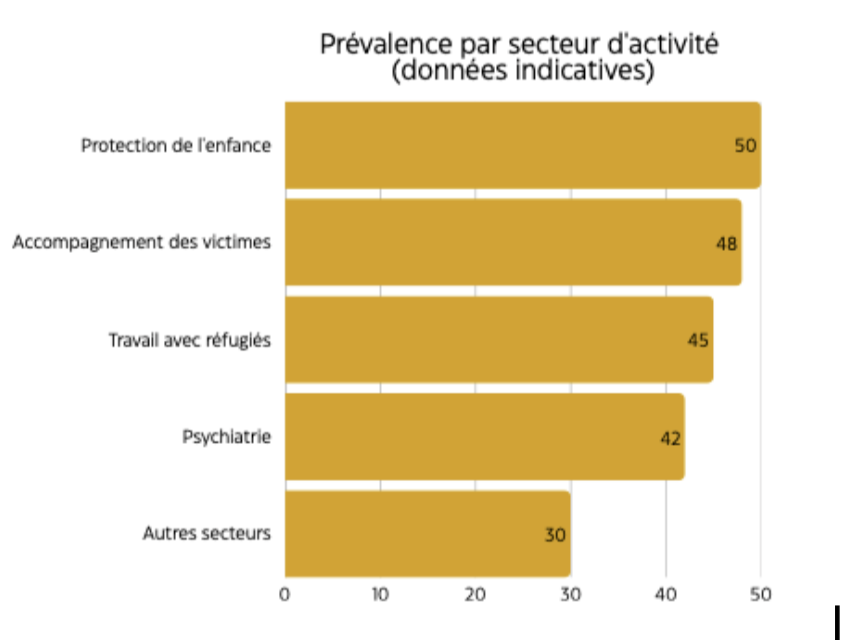 Les données ne laissent pas beaucoup de place au doute. Jusqu’à 50 % des travailleurs sociaux présenteraient des symptômes de stress traumatique secondaire, dont une part significative relève du traumatisme vicariant (Bride, 2007 ; Hensel et al., 2015). Et les taux les plus élevés sont systématiquement observés dans les secteurs de la protection de l’enfance, de l’accompagnement des victimes, et du travail auprès des personnes réfugiées ou en psychiatrie. (Droit d’enfance)